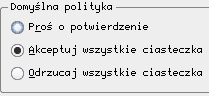 Dość obszerna zakładka. Podstawowe ustawienia, które powinniśmy tutaj to Konqueror w zakładce Przeglądarki WWW. Na początek ciasteczka: ustawiamy domyślną politykę by Konqueror akceptował wszystkie ciasteczka (pytanie o zezwolenie dla każdego cookie jest irytujące). Jeżeli zaznaczymy również Traktuj wszystkie ciasteczka jako tymczasowe to po zamknięciu przeglądarki wszystkie cookies zostaną usunięte co jest m.in. równoznaczne z wylogowaniem ze wszystkich stron stosujących cookie.