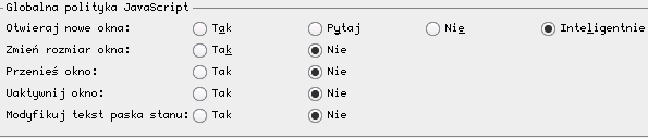 Wyłączenie obsługi JS może zablokować działanie niektórych stron, np. niektóre panele kont pocztowych korzystają z Popupów przy pisaniu emaila czy jego wysyłaniu... Kolejną ciekawą opcję znajdziemy w Przeglądanie WWW. Możemy tam ustawić by linki otwierające się w nowym oknie przeglądarki (TARGET="_BLANK") otwierały się w nowej zakładce: