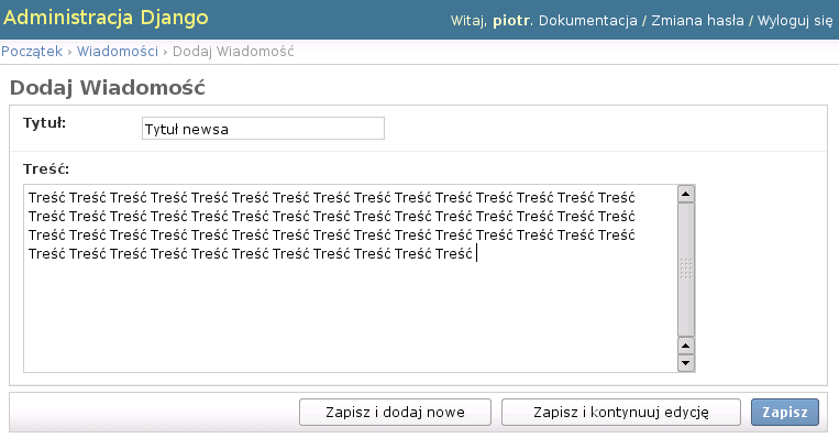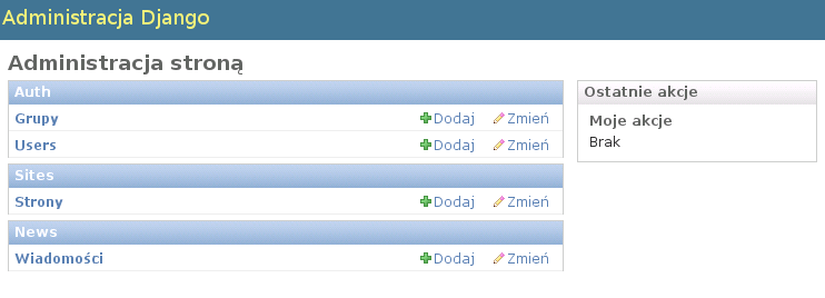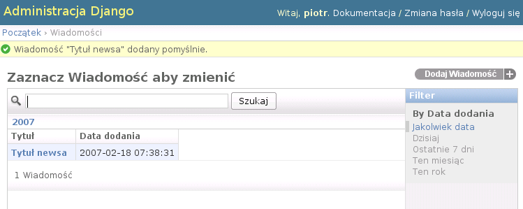 {% extends "index.html" %} {% block content %} {% if object_list %} {% for new in object_list %} <h3>{{ new.title }}</h3> <p>{{ new.text }}... {{ new.date|date:"d.m.Y" }}</p> {% endfor %} {% if has_previous %} <div style="text-align:center;"><a href="/?page={{ previous }}"><b>Nowsze Wiadomości</b></a></div> {% endif %} {% if has_next %} <div style="text-align:center;"><a href="/?page={{ next }}"><b>Starsze Wiadomości</b></a></div> {% endif %} {% else %} Brak wiadomości {% endif %} {% endblock %} - Otwórz główną stronę swojej aplikacji w przeglądarce: http://localhost:8080/. Powinieneś zobaczyć coś takiego: