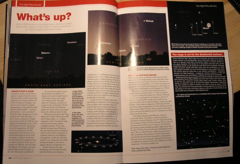 Treść uzupełniają także stałe pozycje jak najnowsze doniesienia ze świata astronomii, opis nocnego nieba z bieżącymi mapkami, czy porady dla astroamatorów. Znajdziemy też dość szczegółowe reklamy brytyjskich sklepów astronomicznych jak Green Witch, The Widescreen Centre, Altair Astro czy StarlightXpress. Nie zabraknie też zapowiedzi i planu wykładów na targach AstroFest 2011.
