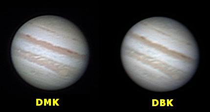 HerbertHeimel na forum.astronomie.de wykonał i porównał zdjęcia Jowisza wykonane za pomocą monochromatycznej kamerki DMK i kolorowej DBK. Patrząc na zestawienie można dopatrzyć się większej ilości szczegółów na fotografii wykonanej za pomocą monochromatycznej kamerki. Na taki wynik oczywiście składa się seeing, czy obróbka, ale także różnice w jakości materiału zebranego z tych kamer.