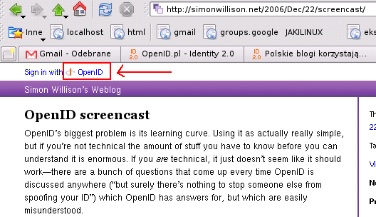 Idę na stronę wspierającą openID (blog autora screencasta o open id)