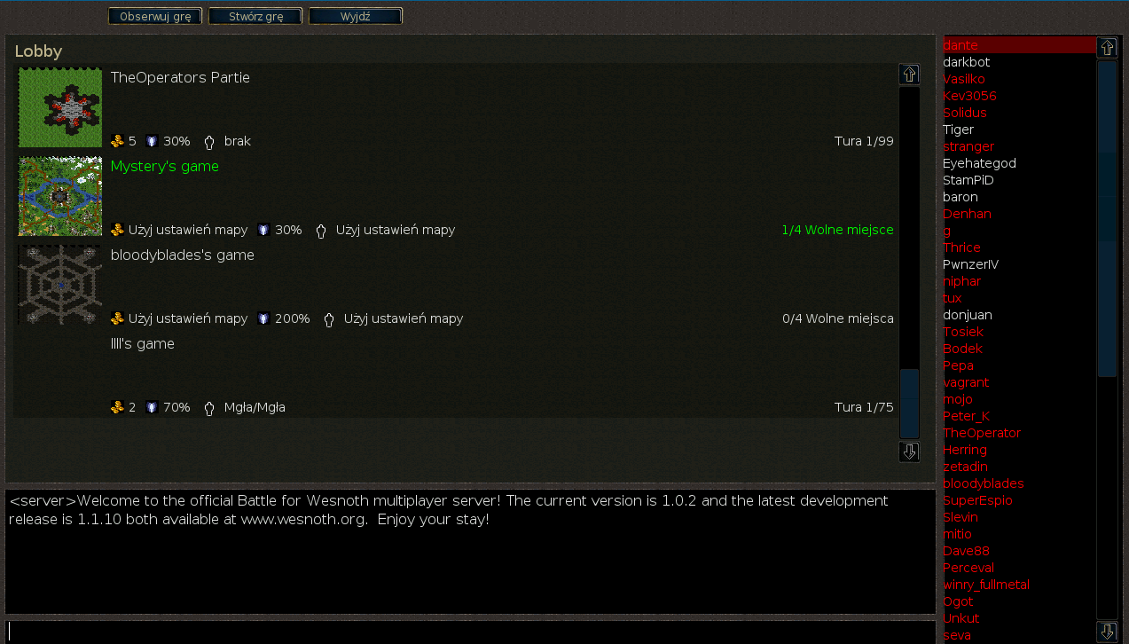 Po połączeniu się z serwerem zobaczymy listę toczących się gier: