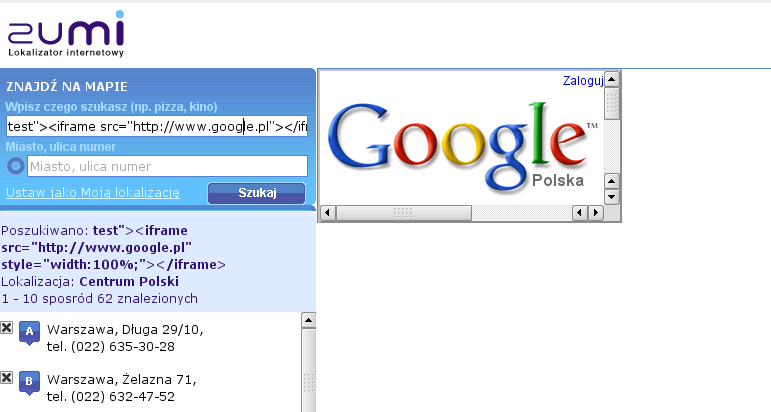 Zumi z błędami RkBlog PL Programowanie Frontend Komponenty 11 July 2008 Comments Share zumi.pl - lokalizator Onetu służy do wyszukiwania ulic, sklepów czy innych instytucji i budynków. Jeszcze parę dni temu system wyszukiwania zawierał lukę umożliwiającą wstrzyknięcie kodu HTML. Po wysłaniu maila w tej sprawie błąd został poprawiony. RkBlog Share Komponenty i dodatki, 11 July 2008